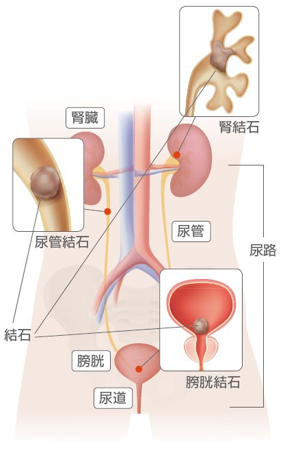 尿路結石症とは、尿路(腎臓から尿道までの尿の通り道)に、結石(尿に含まれるカルシウム・シュウ酸・リン酸・尿酸などが結晶化したもの)ができる病気です。