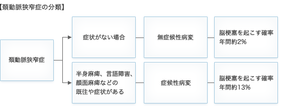 頚動脈狭窄症は診断までに症状を起こしたことがあるかどうかで、大きく二つに分類されます。この二つは同じ病気でありながら、脳梗塞を起こす確率が大きく違うため、分類する必要があります。