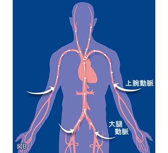 頚動脈ステント治療では、通常脚の付け根(そけい部)の血管からカテーテルと呼ばれる管を挿入し、血管の内から病変部にアプローチして治療を施します。(図B)