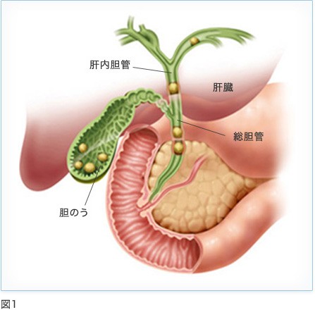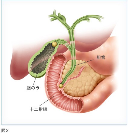 胆道結石は、症状が全くない場合もありますが、結石が胆嚢の出口や胆管の十二指腸への出口に嵌(はま)ってしまうと、痛みが生じます(図2)。また、脂っこいものを食べた後に心靴窩部(みぞおち)や右季肋部(みぞおちの右)が痛んだり、血液検査で肝臓・胆道の酵素であるGOT、GPT、LAP、γ-GTP(ガンマ-GTP)、ALPの上昇が見られたりすると胆道結石が疑われます。胆管結石で感染を起こすと化膿性胆管炎といって胆道全体に感染が及び、黄疸や胆道感染により発熱します。この様な場合には緊急入院や緊急の治療が必要な状態と言えます。