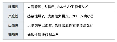 大腸の病気は、大きく腫瘍性、炎症性、出血性、機能性に分けられ、腫瘍性のなかに大腸腺腫、大腸癌などが属しています。