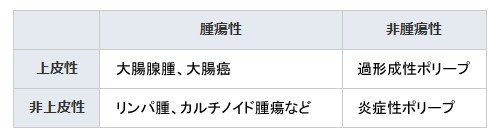 その多くは上皮性・腫瘍性病変であり、なかでも大腸腺腫が最も多く、早期癌も含まれます。