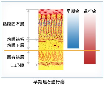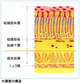 大腸の壁構造は5層構造になっており、大腸の内側の表面を粘膜固有層と呼ばれ吸収や粘液の分泌の役目があります。また、ポリープなどの腫瘍が発生するのもこの層です。