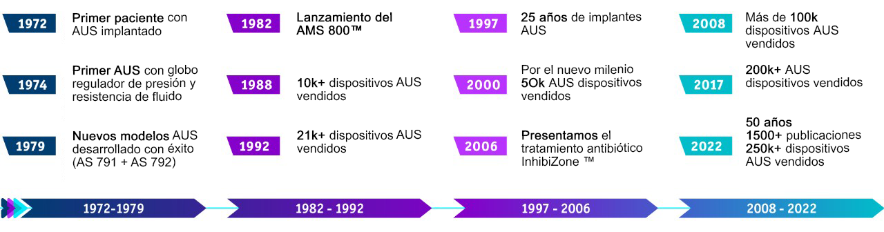 Desarrollado inicialmente en 1972, estamos orgullosos de la historia de innovación de nuestros productos de Esfínter Urinario Artificial (AUS por sus siglas en inglés). A lo largo de los años, hemos mejorado nuestra tecnología para optimizar los resultados para los hombres con IUE y sus médicos tratantes con el AMS 800 AUS convirtiéndose en el estándar de oro actual para el cuidado de la incontinencia.1-3