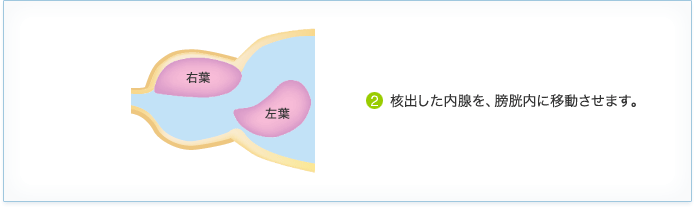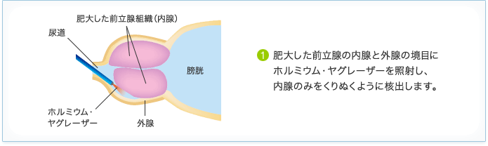 前立腺の組織は、尿道の左右(左葉・右葉)、および人体下側(中葉)からそれぞれ内側に向かって肥大していきます。HoLEPはホルミウム・ヤグレーザーを照射し内腺と外腺との境目に入り、内腺のみを核出します。核出された3つの前立腺組織は一度、膀胱内に移動させます。