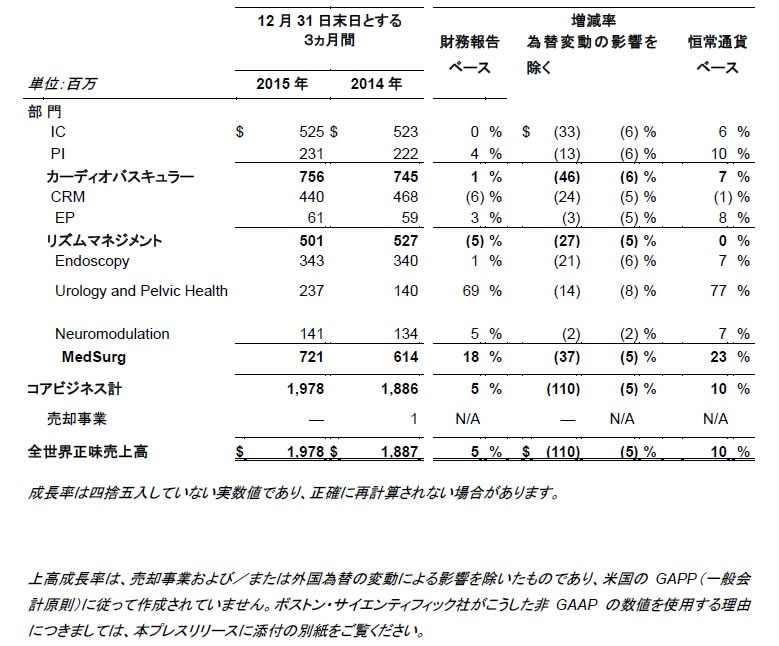 マサチューセッツ州マールボロ (2016年2月4日) -ボストン・サイエンティフィック社 (NYSE: BSX)は、2015年12月31日に終了した第4四半期に19億7,800万ドルの売上を計上しました。これにより、営業収益は、前年に比べ10パーセント (為替変動の影響および売却事業の影響を除く) 、報告ベースでは5 パーセントの増加となりました。同期の1株当たり調整後利益は前年の1株当たり0.22ドルから0.26ドルに増加し、GAAPベースの損失は前年の1株当たり(0.23)ドルに対して1株当たり(0.11) ドルとなりました。