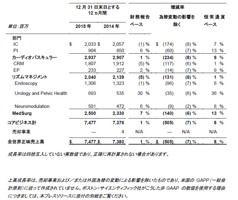 「当社の2015年度業績は、当社の事業全体、そして拠点とする地域全体で継続的な勢いと安定した実績を挙げることができました。」とボストン・サイエンティフィック社社長兼CEOのマイク・マホーニーは述べました。「当社の革新的なパイプラインと継続的なグローバル展開の相乗効果により、既存の製品開発と事業買収を通じて当社が市場に提供した製品やプログラムは、2016年以降もさらに多くの患者に利益をもたらすでしょう」。