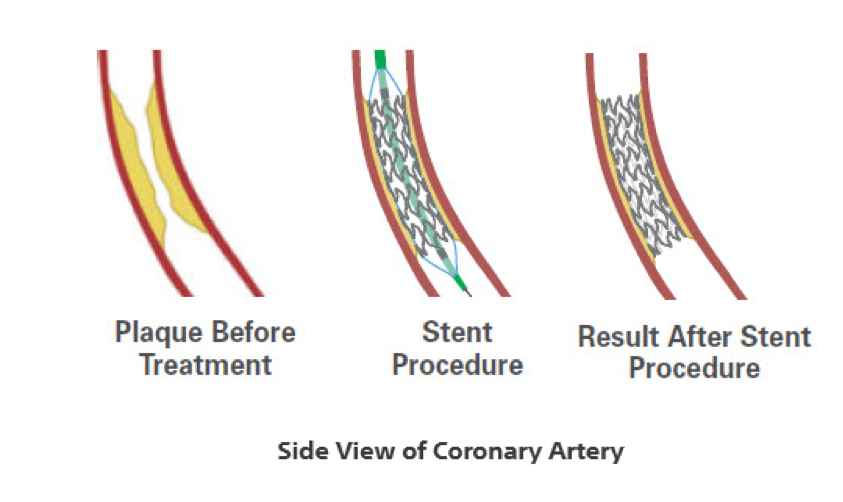 - Muitos pacientes submetidos a uma angioplastia podem também receber o implante de um stent. Os stents são parecidos com a mola da ponta de uma caneta. Depois do procedimento de angioplastia abrir a artéria, um stent é colocado e expandido para se acomodar ao tamanho da artéria. O stent permanece na artéria, ajudando a manter um fluxo sanguíneo livre e desobstruído. Com o tempo, a parede da artéria se cicatriza ao redor do stent. Durante o período de cicatrização é necessário que o paciente tome medicamentos para impedir que o sangue se coagule dentro do stent.