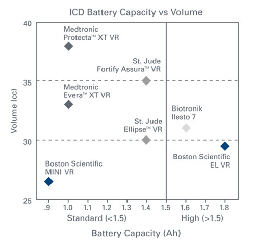 Die Batteriekapazität ist fast doppelt so hoch wie die Kapazität der ICDs und CRT-Ds von Medtronic.2
