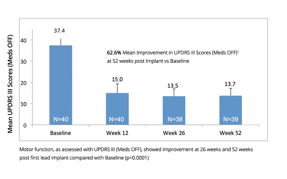 El sistema de ECP Vercise demostró una mejora significativa de la función motora (p<0,0001), evaluada conforme a la reducción media del 62,6 % (±19,8) obtenida en las puntuaciones de UPDRS III en la semana 26, que se mantuvieron hasta la semana 52 después de la colocación del cable (p < 0,0001). | |