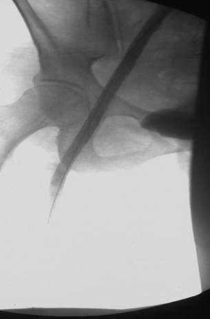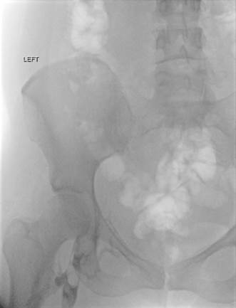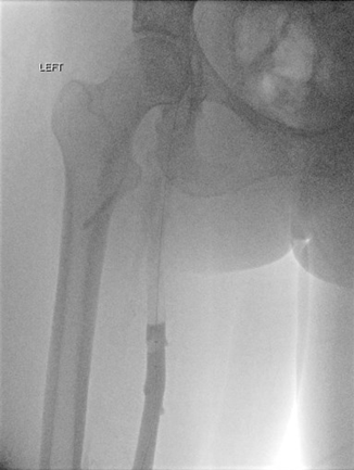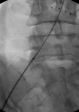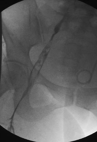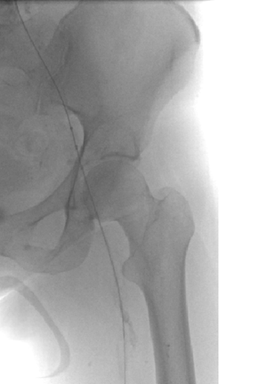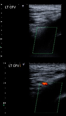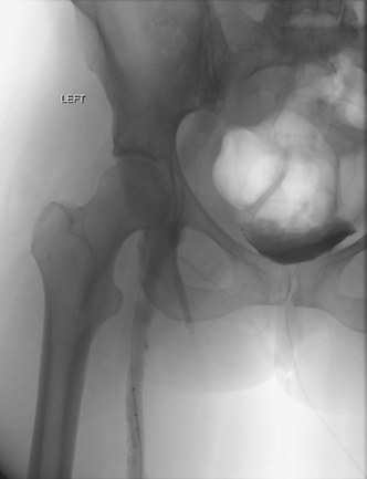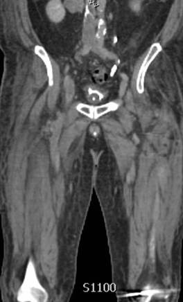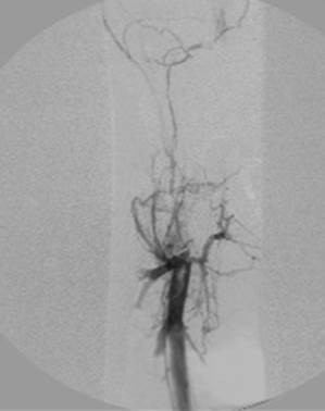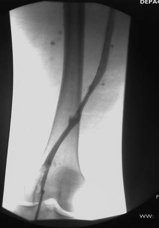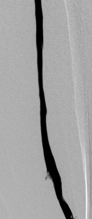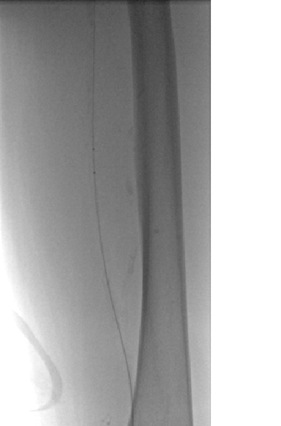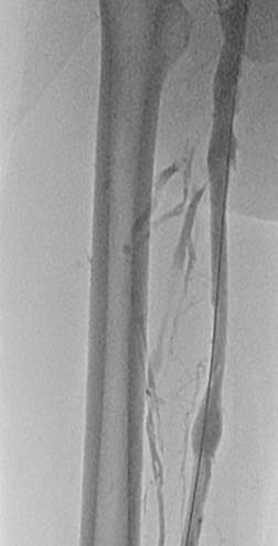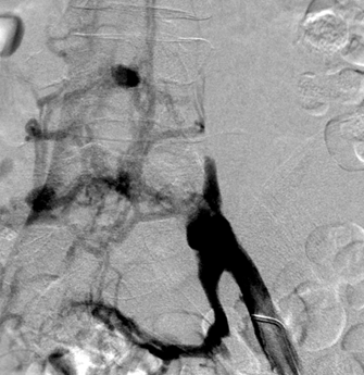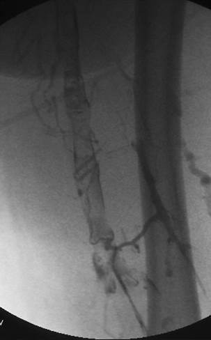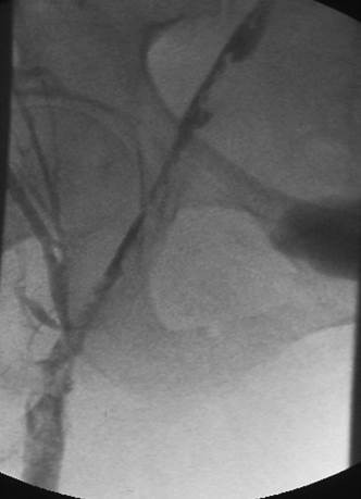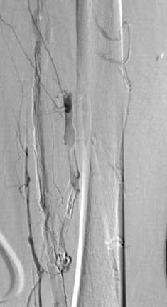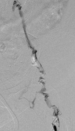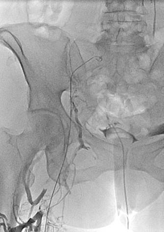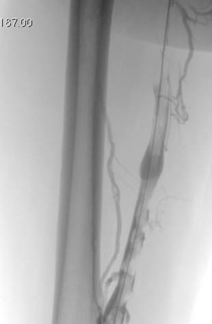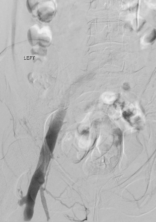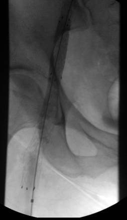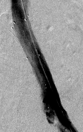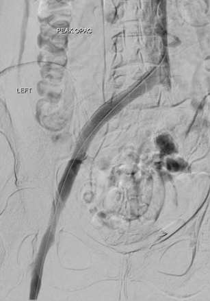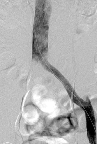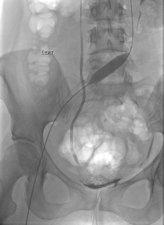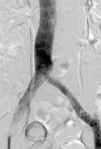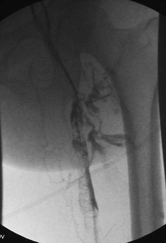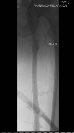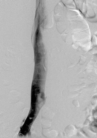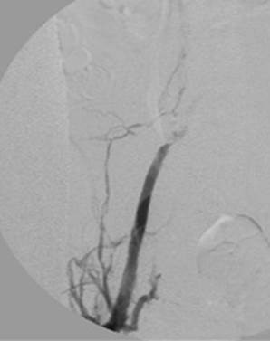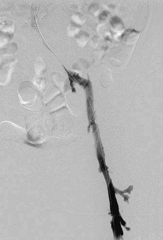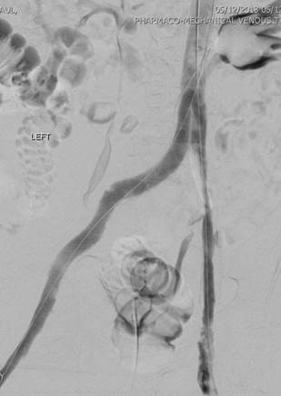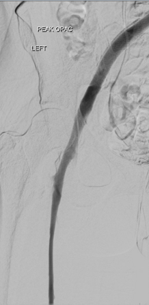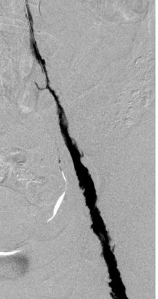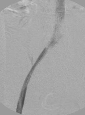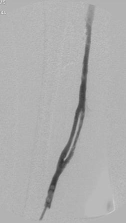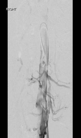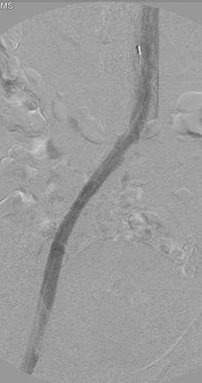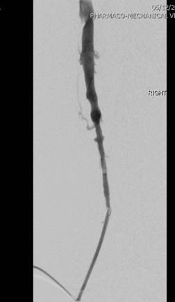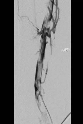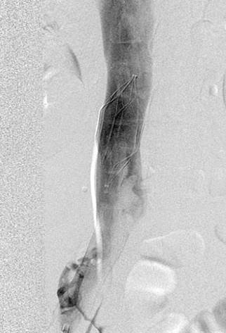 TVP iliofemoral aguda en la pierna izquierda tratada con el sistema de trombectomía AngioJet™ y endoprótesis Wallstent Uni™.