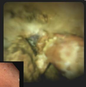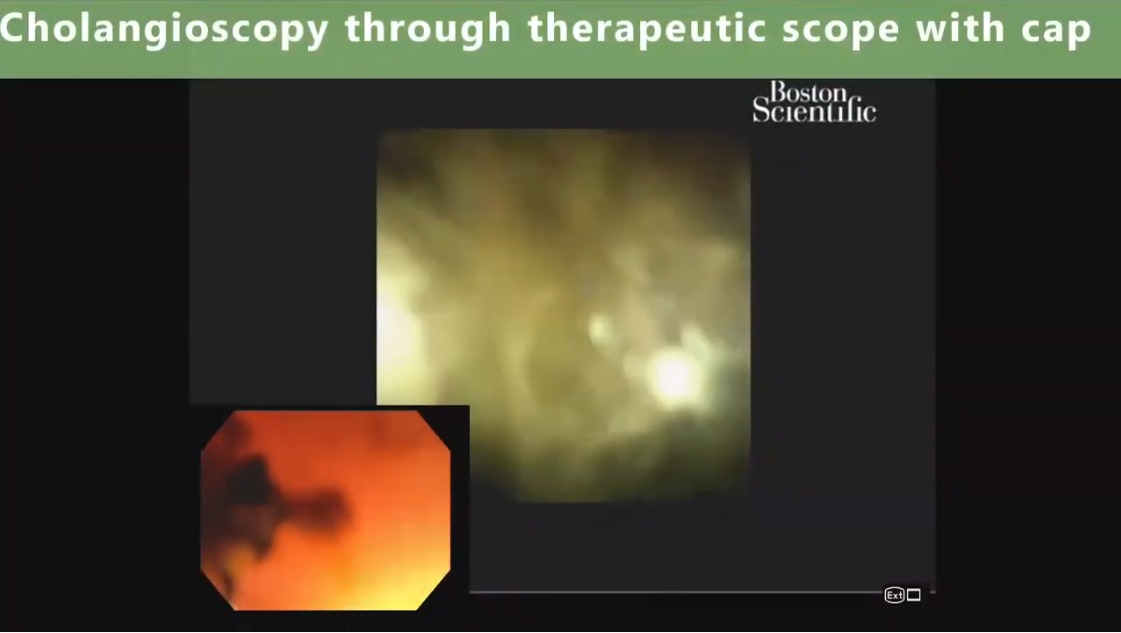 Cholangiogram through choledochoduodenostomy revealed multiple filling defects located mostly in liver segment IV. Extraction of many stones was achieved using a SpyGlass™ Retrieval Basket through 18 Fr gastroscope. Segment IV takeoff was dilated to 8 mm using a through the scope balloon. Cholangioscopy using SpyScope™ DS through therapeutic gastroscope with cap was performed revealing many remaining intraductal stones (Figure 3). Extraction of stones with SpyGlass Retrieval Basket enabled complete clearance of segment IV stones (Figure 4, 5).