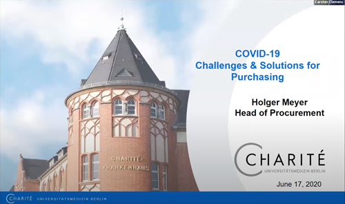 Watch a webcast from procurement point of view about challenges and lessons learned during the COVID-19 crisis. Mr. Holger Meyer, Head of Procurement at Charité Berlin in Germany shares his views around logistics and materials procurement, purchasing options and solutions and his expectations from suppliers.