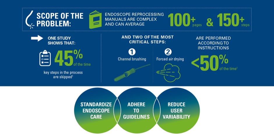Endoscope reprocessing manuals are complex and can be in average more than 100 pages and more than 150 steps. Consequently, studies show that key steps are skipped in the cleaning process 45% of time and that two of the most critical steps, manual cleaning and drying are performed according to instructions less than 50% of time.1