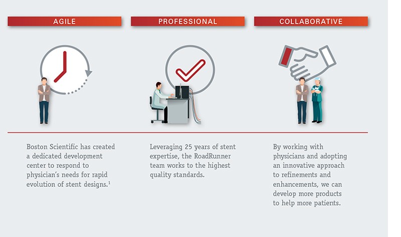 Boston Scientific has combined a 25 year legacy of stent expertise, an ongoing commitment to technological innovation and a culture of putting customer need and expectation at the heart of all we do in our RoadRunner program. Boston Scientific has created RoadRunner – a dedicated stent innovation centre to respond to physician’s needs for rapid evolution of stent designs.1 This RoadRunner team is a small, cross-functional team operating as a start-up company within Boston Scientific and based in Galway in Ireland. Having identified a need, the RoadRunner team works with key physicians to bring the right product to market.1