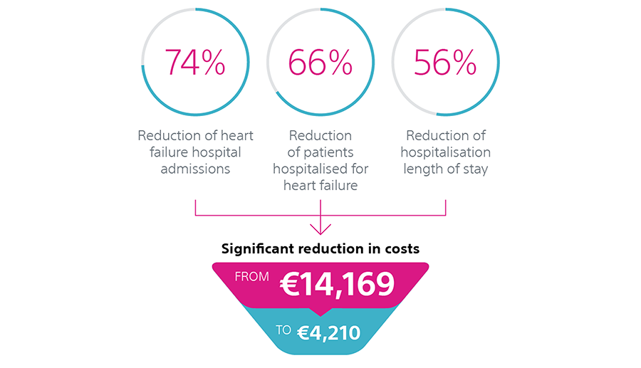 HeartLogic reduces hospitalisations for decompensated heart failure and significantly reduces the costs per patient for the healthcare system, as described in the Heggermont et al publication.11