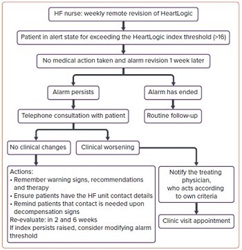 Authors also reminded that HeartLogicTM should be implemented in a multidisciplinary heart failure team and that it would be desirable to have a clear follow-up protocol in order to have alerts ‘handled’ in a structured way. An example proposed was reported in the central figure of the paper (Figure 6).