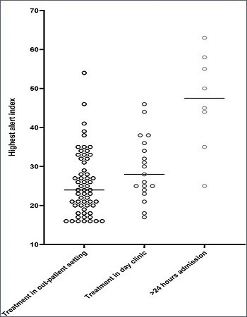 Median maximal alert index was 20 [IQR 17-25] in false positive alerts compared to 25 [IQR 20-35] in true positive alerts, p=0.003 (Figure 7).