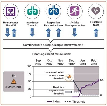 When the HeartLogicTM index exceeds a programmed threshold, an HeartLogicTM alert occurs, indicating a higher risk of decompensation (Figure 4).