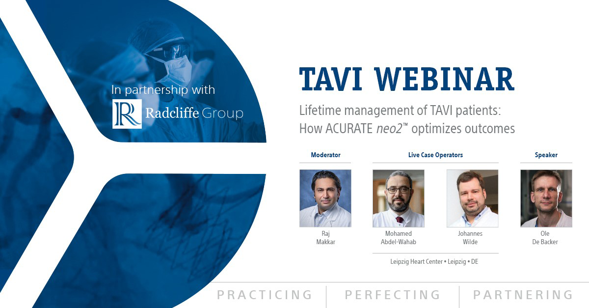 Webinar: Thursday 27th May from 15:00 to 16:00 CET with a LIVE CASE from Leipzig Heart Center, Germany. Join us as Prof Makkar and Prof De Backer discuss latest clinical evidence for the novel ACURATE neo2™ Aortic Valve System, designed with a number of new features and to understand how improvements in design may help optimize patient outcomes. The live case from Leipzig Heart Centre, presented by Prof Abdel-Wahab and Dr Wilde will address the topic of coronary access after TAVI, challenges and solutions to achieve a successful implant that will preserve coronary access for future interventions