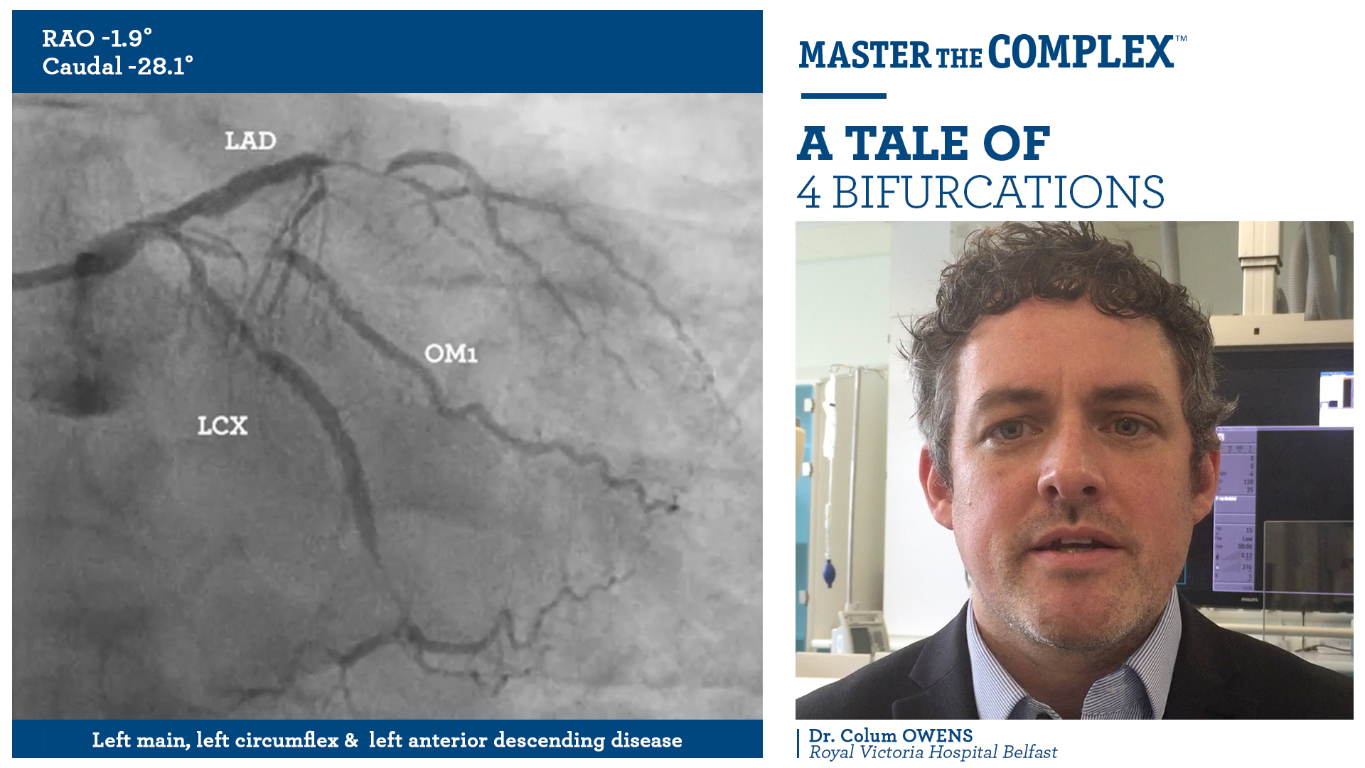 - Diagnostic angiography showed severe 3-vessel disease with complex bifurcations involving the distal right coronary artery (RCA) (Watch Distal RCA Angio), left main stem (LMS) , left circumflex bifurcation (LCX) (Watch Left Main Angio) and an occluded left anterior descending/2nd diagonal artery bifurcation (LAD/D2) (Watch Occluded Left Angio)