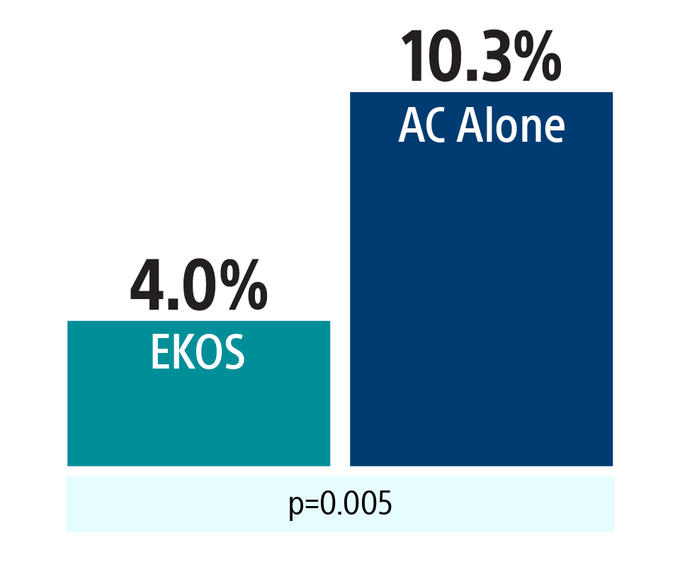 EKOS demonstrated superiority to AC alone, resulting in a significantly lower rate of the primary composite endpoint (4.0% vs. 10.3%; p=0.005).