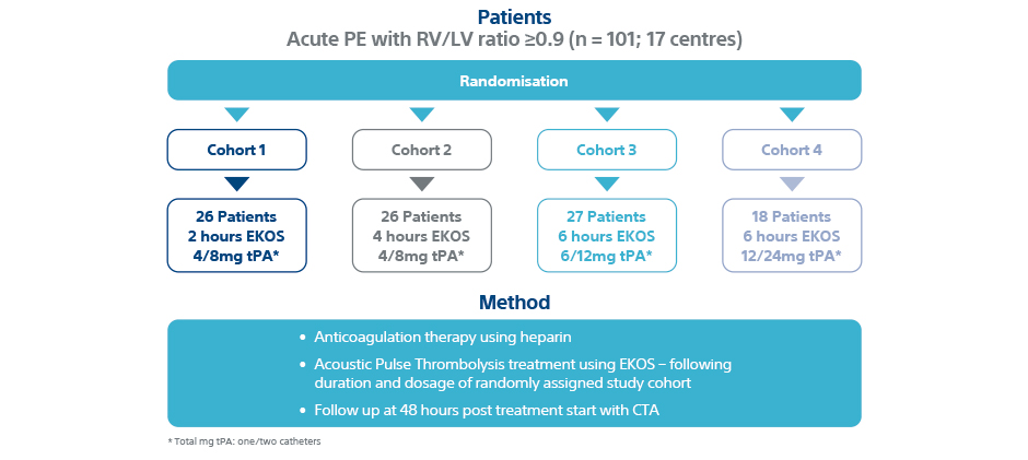 Tapson, Victor, et al., “A Randomised Trial of the Optimum Duration of Acoustic Pulse Thrombolysis Procedure in Acute Intermediate-Risk Pulmonary Embolism: The OPTALYSE PE Trial.” JACC: Cardiovascular Interventions Jul 2018, 11 (14) 1401-10.