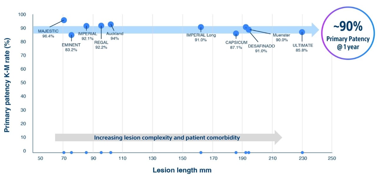 Eluvia™ is the unrivaled SFA stent – no matter the lesion complexity, no matter the patient. Restenosis presents a significant challenge in the management of superficial femoral artery (SFA) disease. Eluvia is specifically engineered for sustained drug release and efficient drug transfer, effectively overcoming challenges associated with peripheral arterial disease (PAD). It consistently delivers durable outcomes, even in the face of challenging SFA disease.