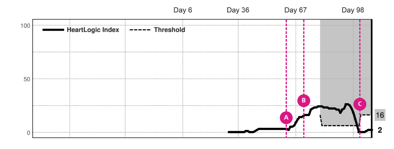 Find out how HeartLogic alerted physicians of worsening heart failure (HF) a day after a patient’s follow-up visit where no HF symptoms were reported. As a result of this proactive alert, the patient was seen by an interventional cardiologist the following day, medications were adjusted and the HeartLogic index returned to baseline.