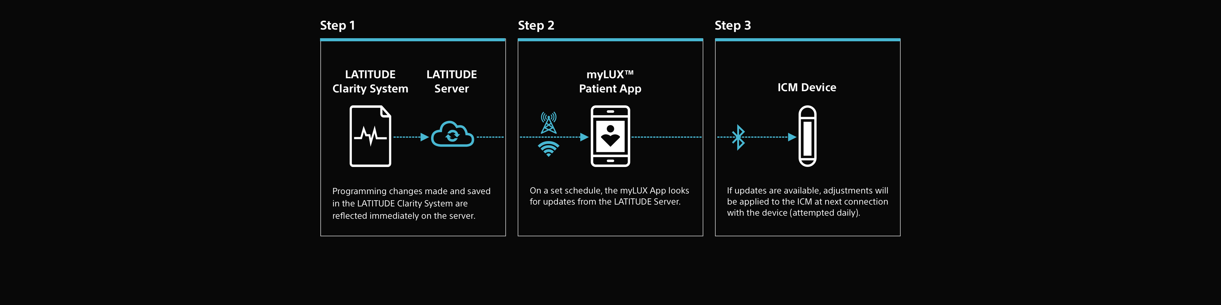 On a set schedule, the myLUX Patient App looks for updates from the LATITUDE server.