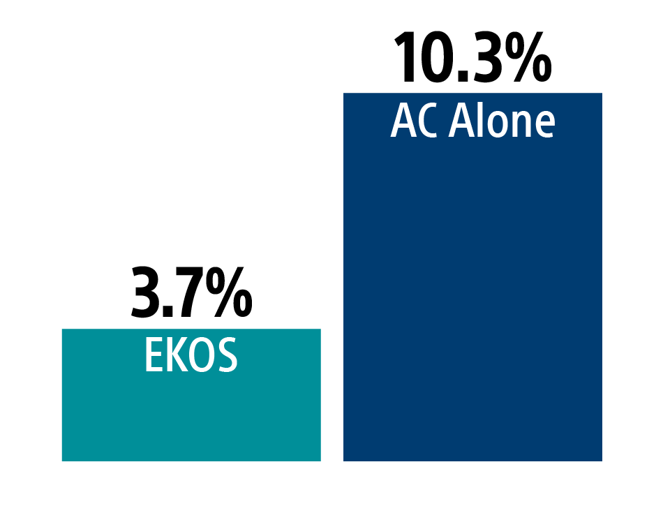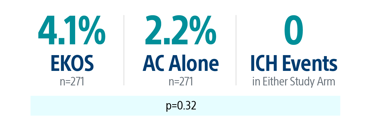 EKOS demonstrated superiority to AC alone, resulting in a significantly lower rate of the primary composite endpoint (4.0% vs. 10.3%; p=0.005).