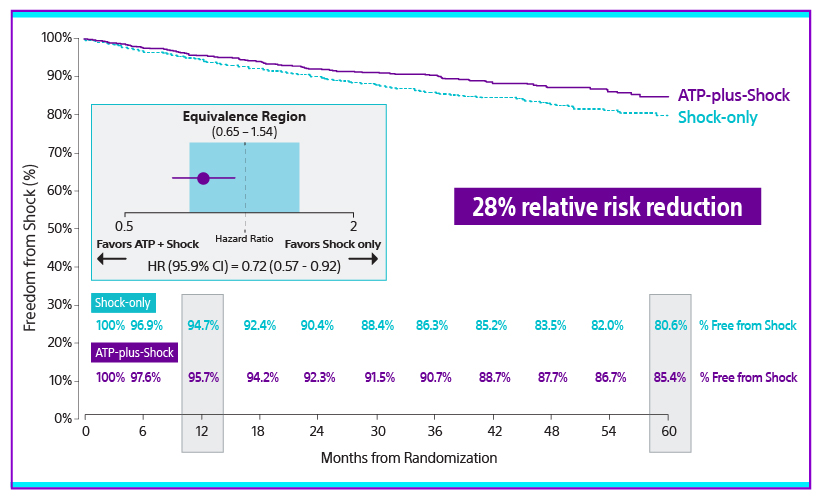 At five years, the percent of patients free from all-cause shocks was 85.4% for the ATP-plus-shock arm vs 80.6% for the shock-only arm.15