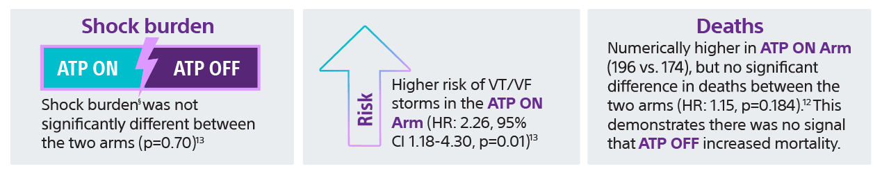 The APPRAISE ATP trial demonstrated superiority with a 28% relative risk reduction in time to first all-cause shock for the ATP ON arm compared to the ATP OFF arm (Log-rank P-value=0.005). This represents an absolute all-cause shock reduction in 1% of PP ICD indicated patients per year.