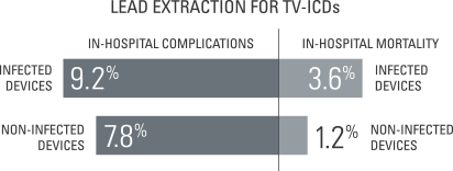 - Data in >91,000 transvenous lead extractions demonstrated that those extracted for infection had significantly higher rates of complications and mortality.4