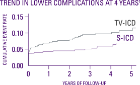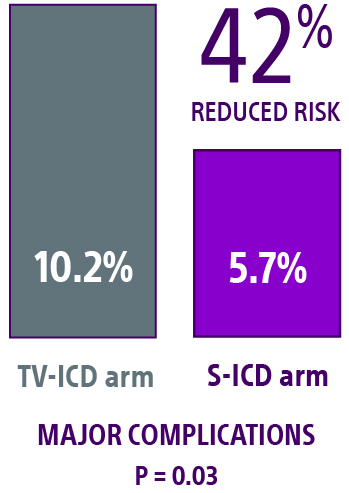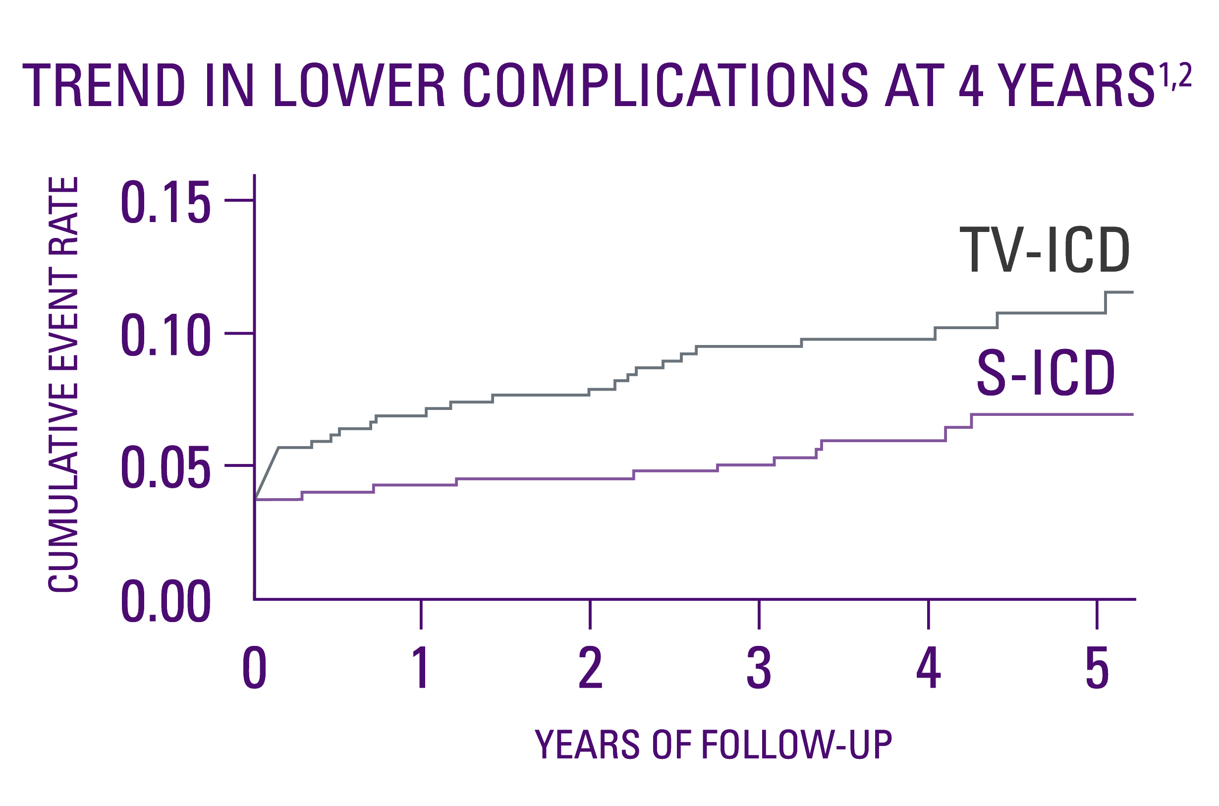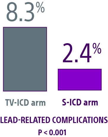 While superiority for the S-ICD was not established for the composite primary endpoint, the S-ICD demonstrated a significantly lower risk of major†- and lead-related complications compared to the TV-ICD.1