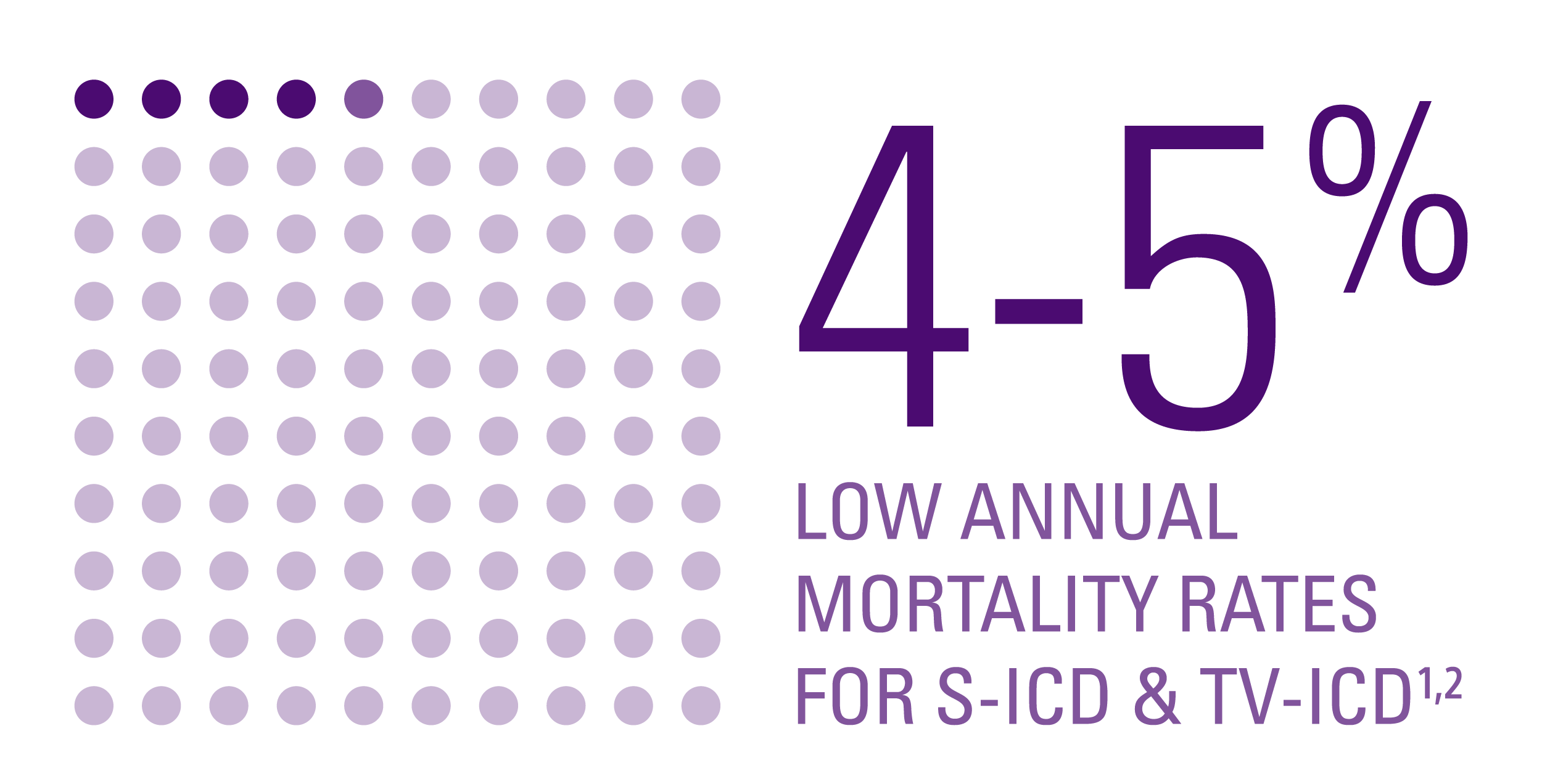 - Secondary prevention for 19% of S-ICD patients and 20% of TV-ICD patients