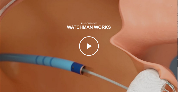 The WATCHMAN Device is a permanent implant designed to close the left atrial appendage in the heart in an effort to reduce the risk of stroke. With all medical procedures there are risks associated with the implant procedure and the use of the device. The risks include but are not limited to accidental heart puncture, air embolism, allergic reaction, anemia, anesthesia risks, arrhythmias, AV (Arteriovenous) fistula, bleeding or throat pain from the TEE (Trans Esophageal Echo) probe, blood clot or air bubbles in the lungs or other organs, bruising at the catheter insertion site, clot formation on the WATCHMAN™ Closure Device, cranial bleed, excessive bleeding, gastrointestinal bleeding, groin puncture bleed, hypotension, infection/pneumonia, pneumothorax, pulmonary edema, pulmonary vein obstruction, renal failure, stroke, thrombosis and transient ischemic attack. In rare cases death can occur. Be sure to talk with your doctor so that you thoroughly understand all of the risks and benefits associated with the implantation of the WATCHMAN Device.