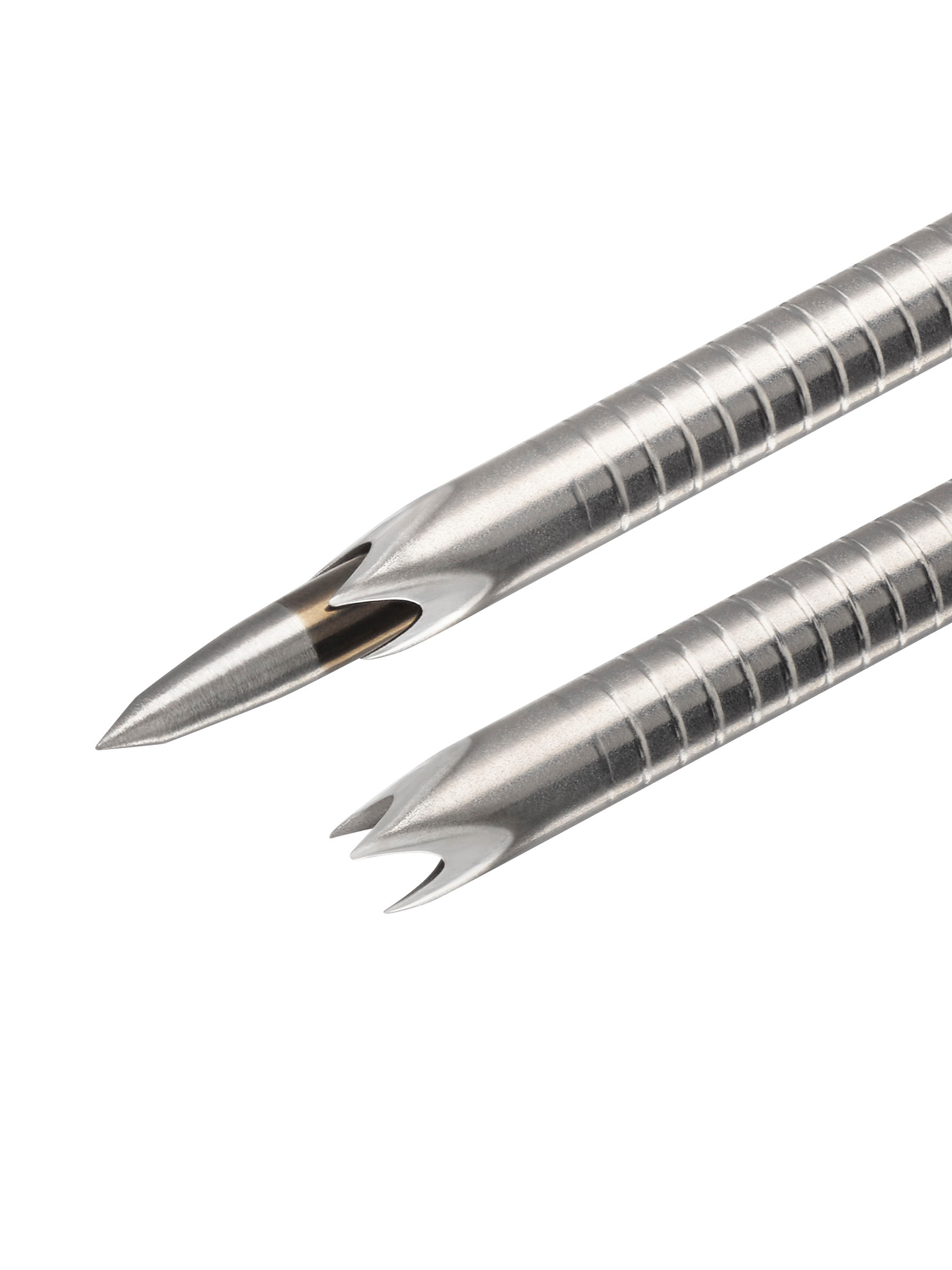 The Franseen needle has 3 symmetrical needle points with fully formed cutting heels3 that are electropolished for sharpness.4 End-cutting EUS needles may be preferred when larger histological specimens and preserved tissue architecture are required, which may aid in histologic processing.7