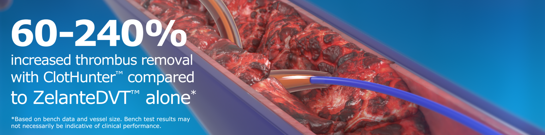 The ZelanteDVT catheter makes it possible to quickly remove large thrombus burden in veins and restore blood flow, giving you the power to dominate DVTs.