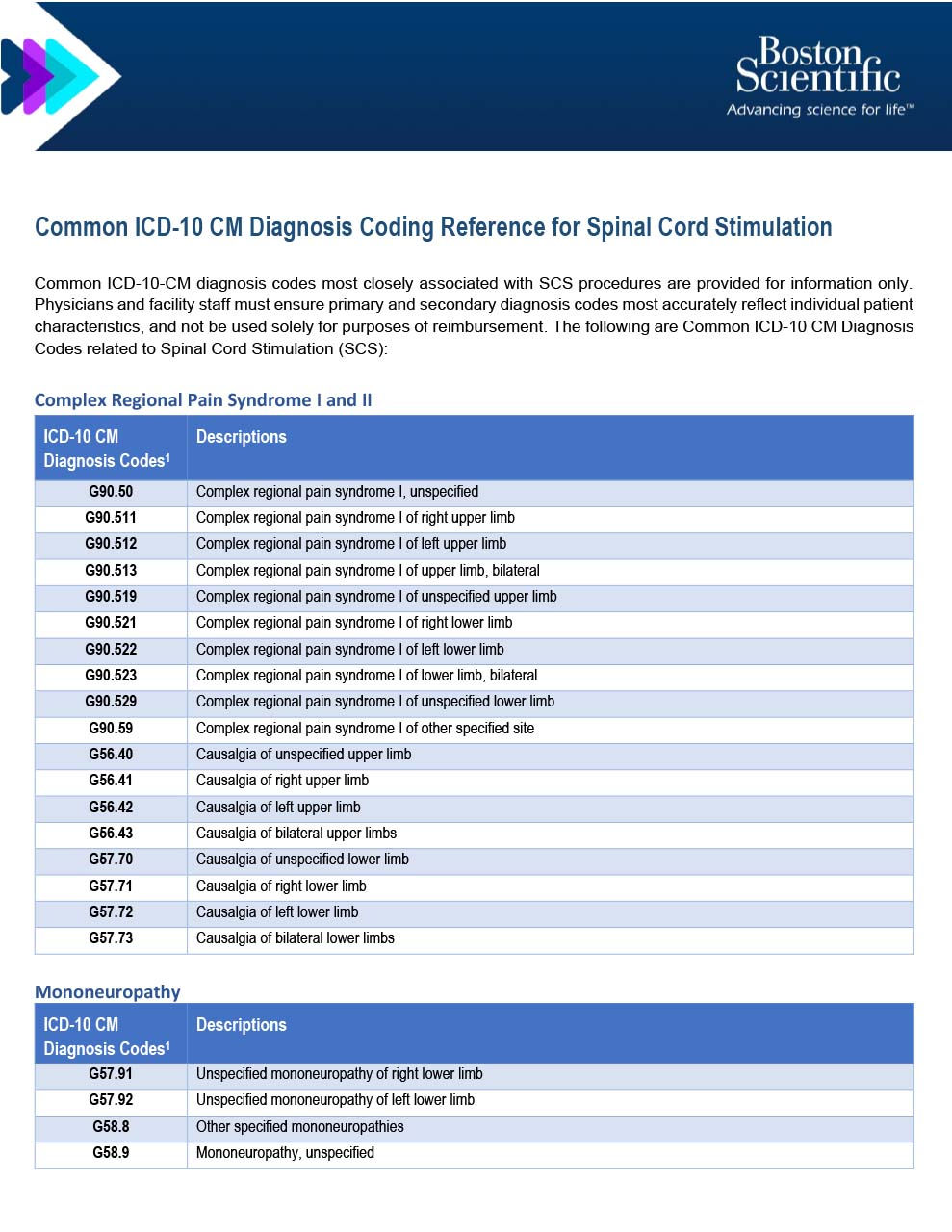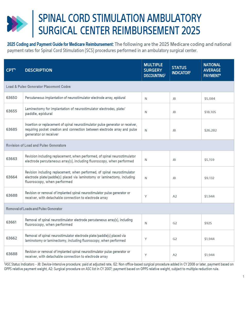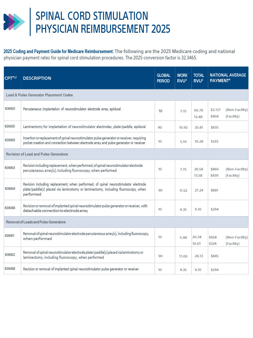Click on our guides to easily look up CPT codes, ICD-10 codes, physician RVUs, and Medicare national average reimbursement rates for spinal cord stimulation (SCS) and radio frequency (RF).