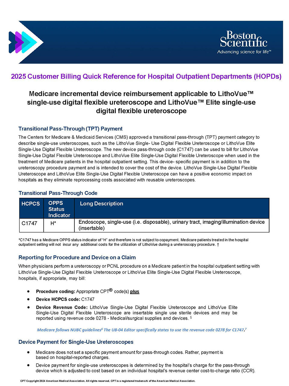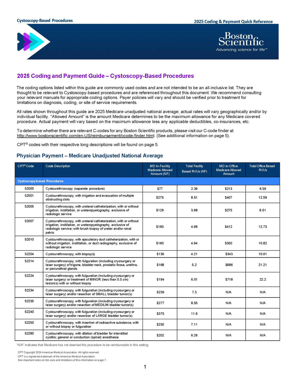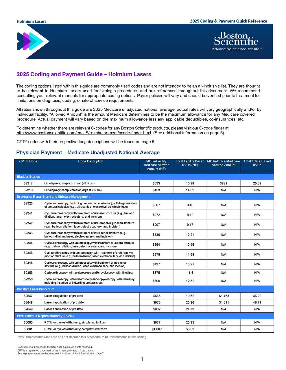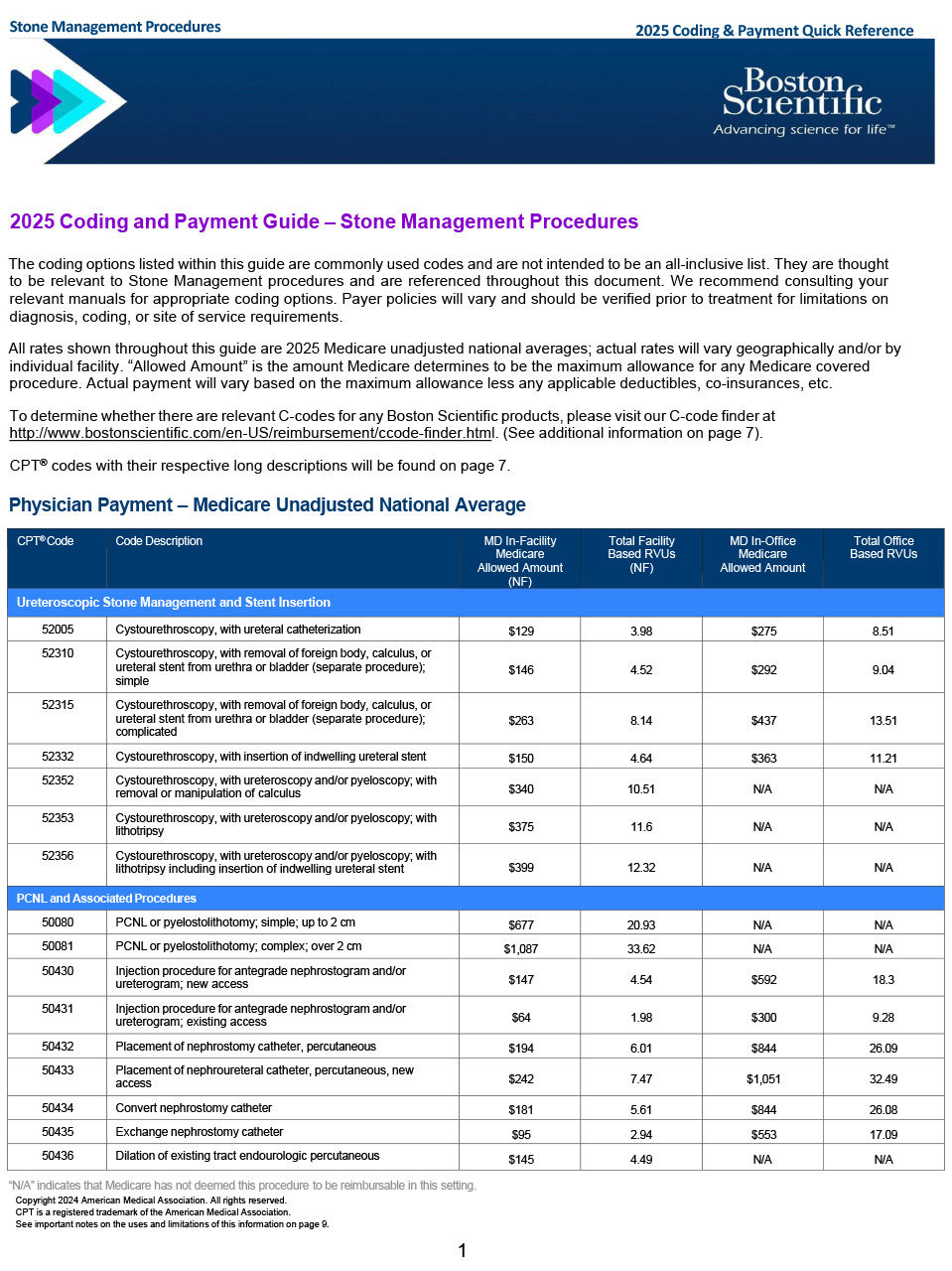 Boston Scientific annually updates and provides procedural coding and reimbursement information for inpatient, outpatient, office, and ASC settings. Click on our guides to easily look up CPT codes, ICD-10 codes, physician RVUs, and Medicare national average reimbursement rates for stone, prostate health, prosthetic urology, and women’s health.