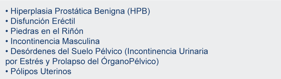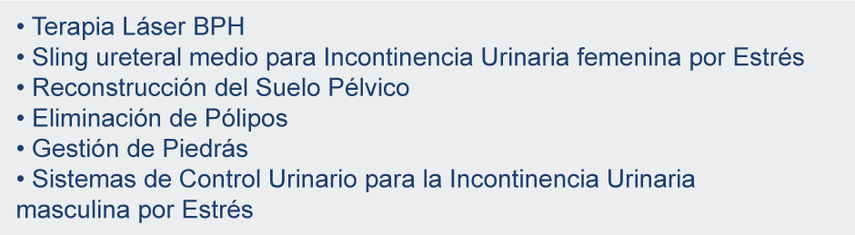 Líderes en el sector de la urología. La adquisición en 2015 de las unidades de negocio Men’s Health y Prostate Health de AMS reafirmó nuestro compromiso con el mercado de la urología, así como nuestro liderazgo en este. Nuestra cartera combinada y nuestro equipo reúnen casi 75 años de experiencia en urología. Respaldamos a nuestros clientes en el tratamiento de cálculos renales, hiperplasia prostática benigna (HPB), disfunción eréctil, incontinencia masculina y trastornos del suelo pélvico. Además, continuamos invirtiendo en soluciones quirúrgicas ginecológicas para el tratamiento de hemorragia uterina anormal y fibromas uterinos.
