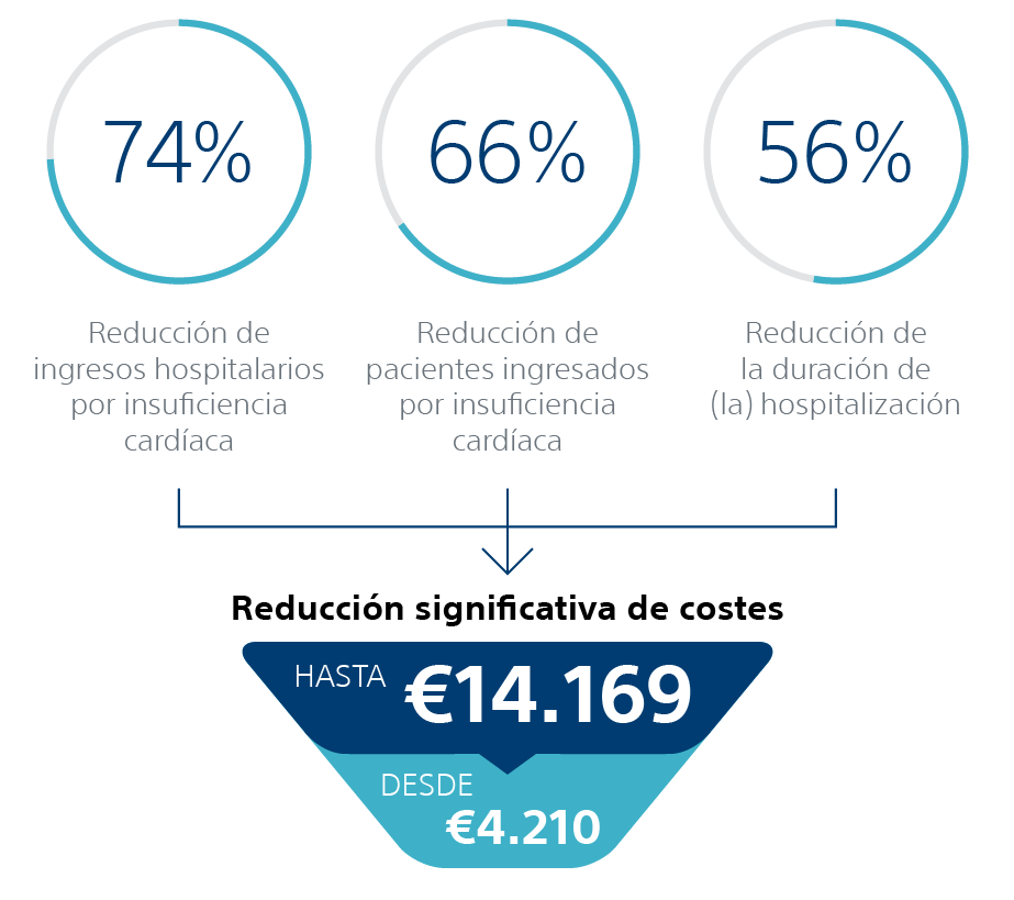HeartLogic reduce las hospitalizaciones por descompensaciones de insuficiencia cardíaca y disminuye significativamente los costes por paciente para el sistema sanitario, como se describe en la publicación de Heggermont et al1