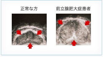 経直腸的前立腺超音波検査の画像による前立腺サイズの比較。仰向けの断面像で、写真の上方が正面。矢印内が写し出された前立腺。前立腺肥大症の患者はその形が丸く、断面積が大きくなっています。