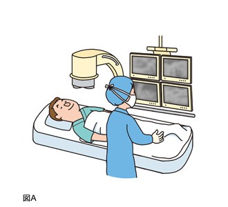 患者さんにベッドに仰向けに寝て頂き、X線を使用して行われます。(図A)