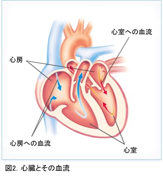 通常、これらの電気信号は洞房結節と呼ばれる、心臓内の小さな領域から出ています。この領域は心臓の右上の部屋、つまり右心房にあります。洞房結節から左心房と右心房に信号が送られると両心房が同時に収縮します。心房の収縮により、その下にある左心室と右心室に血液が満たされます(図2)。電気信号が心室に送られると心室が収縮し、全身に血液を送ります。心拍として感じられるものが、心筋(心室)の収縮です。少し休んだ後にこのサイクルが繰り返されます。