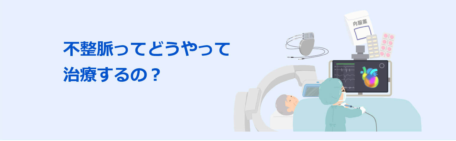 脈拍を整える抗不整脈薬などを用いる「薬物治療」、心臓にカテーテルを通して原因部分を直接治療する「カテーテルアブレーション治療」、ペースメーカを使う「デバイス治療」などがあります。
