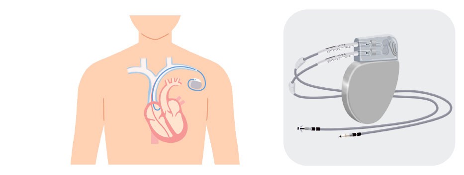 ペースメーカは、心臓の筋肉に電気信号を与え、人工的に心臓を動かすことで拍動のリズムを補助する装置です。ペースメーカ本体を胸部または腹部に埋め込み、本体から出ているリード(導線)を心臓に留置することで電気信号を伝えます。主に脈が遅くなる徐脈性不整脈の治療に使われます。