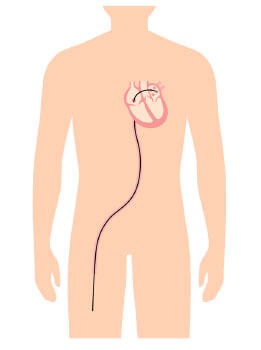 カテーテルと呼ばれる細い管を足のつけ根の血管から心臓の中に入れ、心臓内の組織を直接治療します。焼灼(しょうしゃく:小さなやけど)や冷凍凝固法により、不整脈を引き起こす異常な電気信号が心臓全体に広がらないようにします。頻脈性不整脈の直接の要因の治療を試みる治療法です。