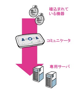 コミュニケータは、読込んだ植込み型機器の情報を、電話回線などを通じて、情報を管理する専用サーバへ送信します。送信は、ご自宅の電話回線か、USB携帯アダプタによる携帯電話回線を通じて行います。